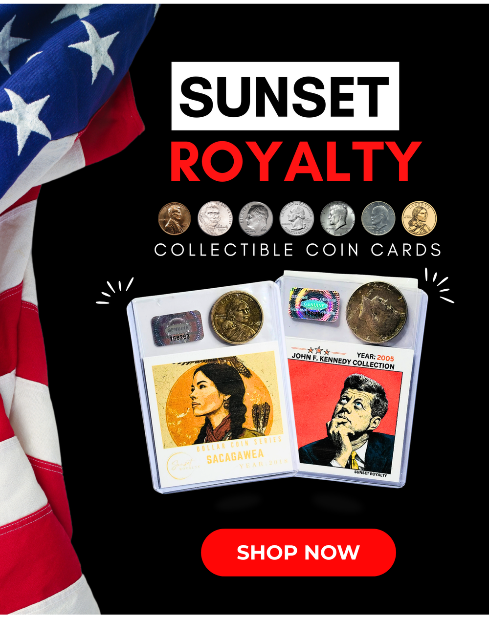 Coin Cards are collectible trading-card–style holders that contain a real U.S. coin securely displayed inside. Each card features artwork and educational information related to the coin, including the year and historical context. They’re designed to be both display pieces and learning tools for collectors of all ages.