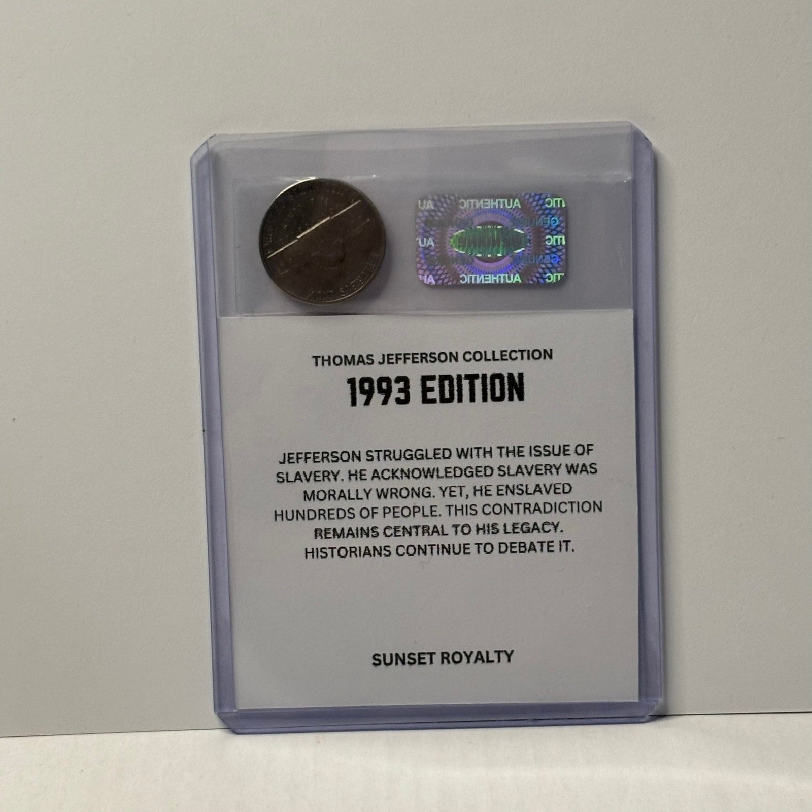 Photos shown are for display purposes only and use placeholder coins and stickers—your coin and card will be similar in style, but the year shown in the images may not match the actual coin you receive. This collection focuses exclusively on American Nickel Coins from 1975 through 2016, with a different card design and historical fact for every year featuring the great Thomas Jefferson. A great addition for coin collectors, history fans, or anyone who loves unique, display-ready collectibles.