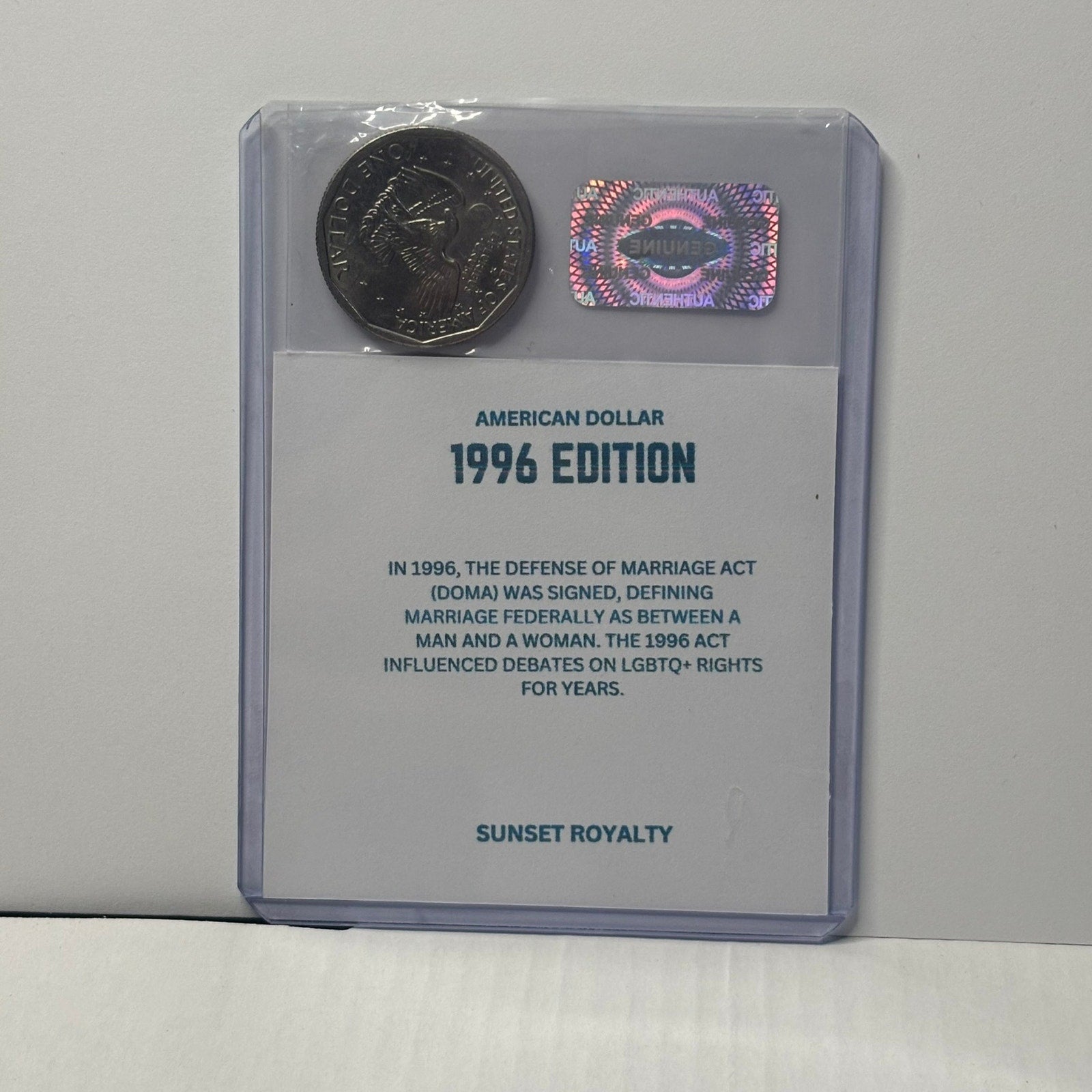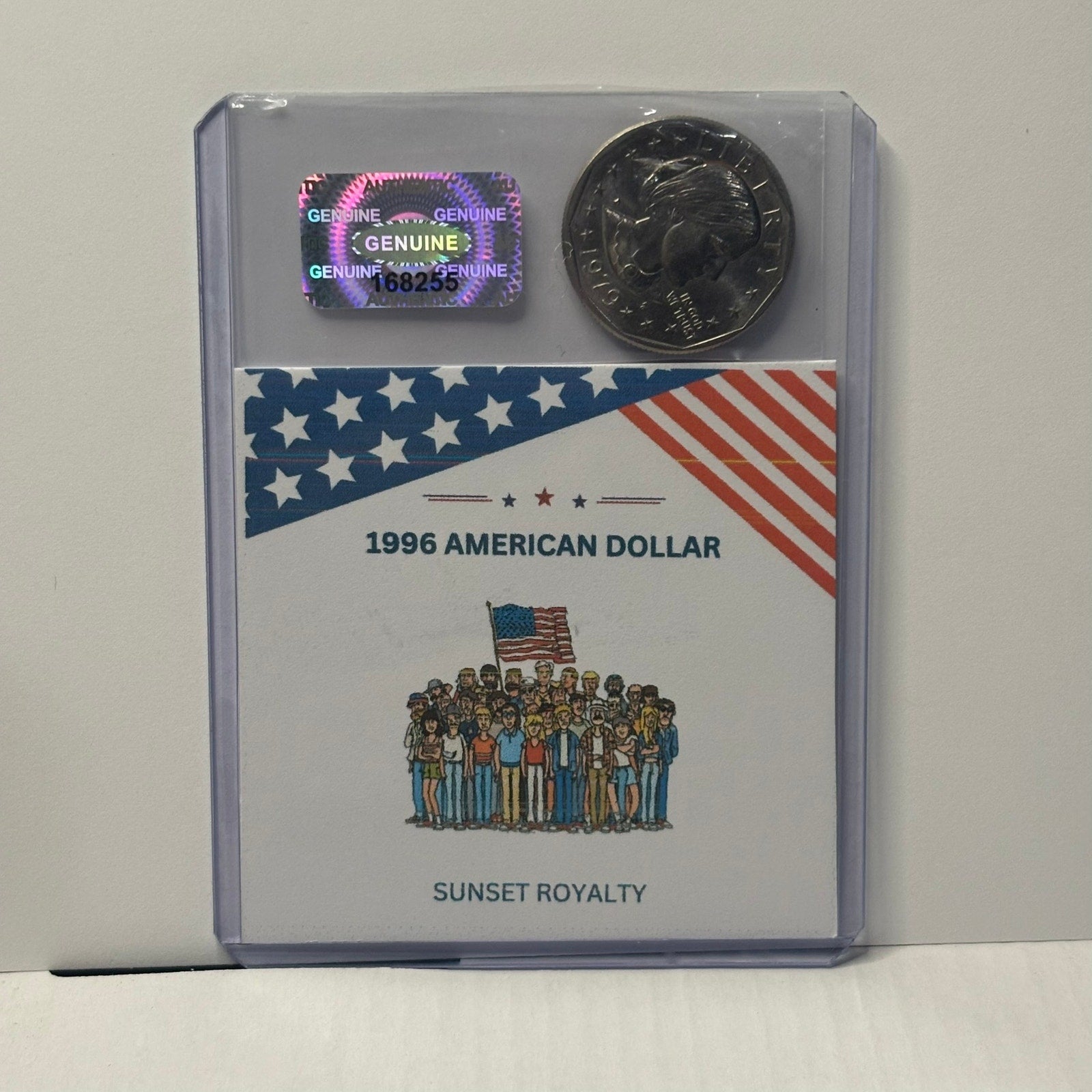 This collectible American Dollar Coin comes securely sealed in a trading-card style top loader case, featuring a custom coin card with a unique image on the front and a fun, historical fact about the coin’s year on the back. Each case includes the coin, the matching year card, and an applied authentication sticker for added collector confidence. Coins are authentic U.S. Dollars, and the year will always match the title of the listing, though coin condition is random and ungraded.