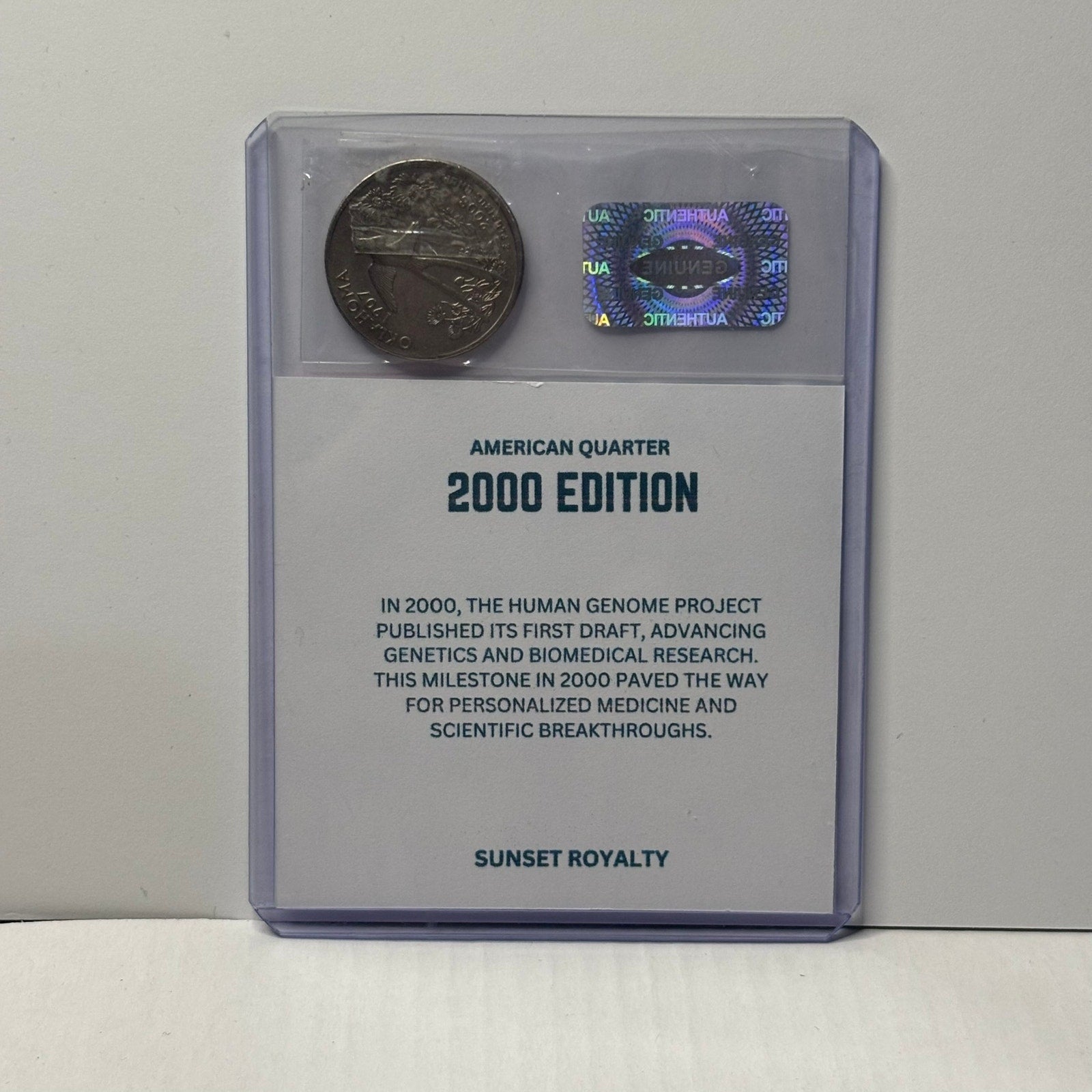 - Authentic U.S. Quarter from the year listed, securely sealed in a trading card top loader