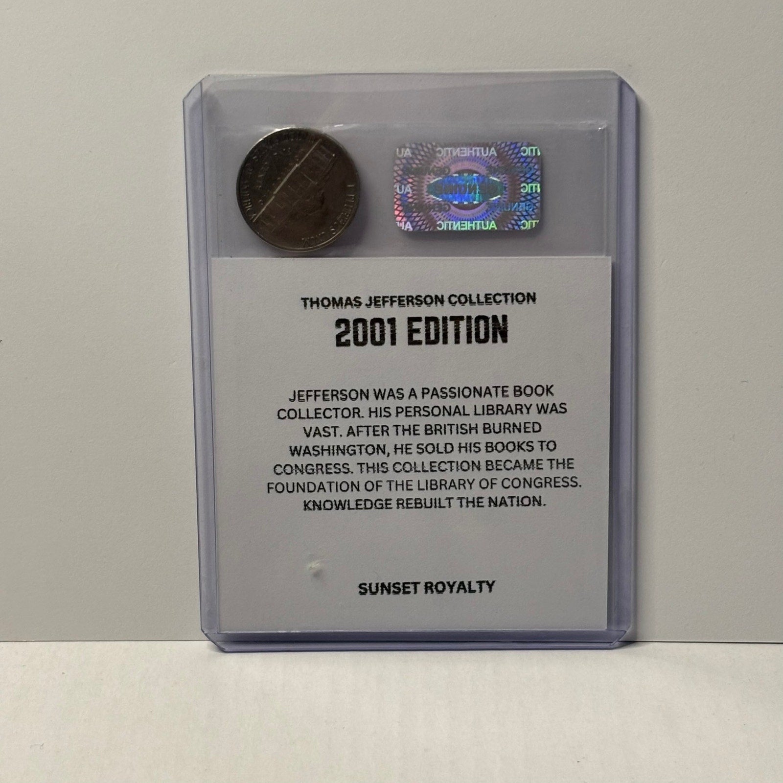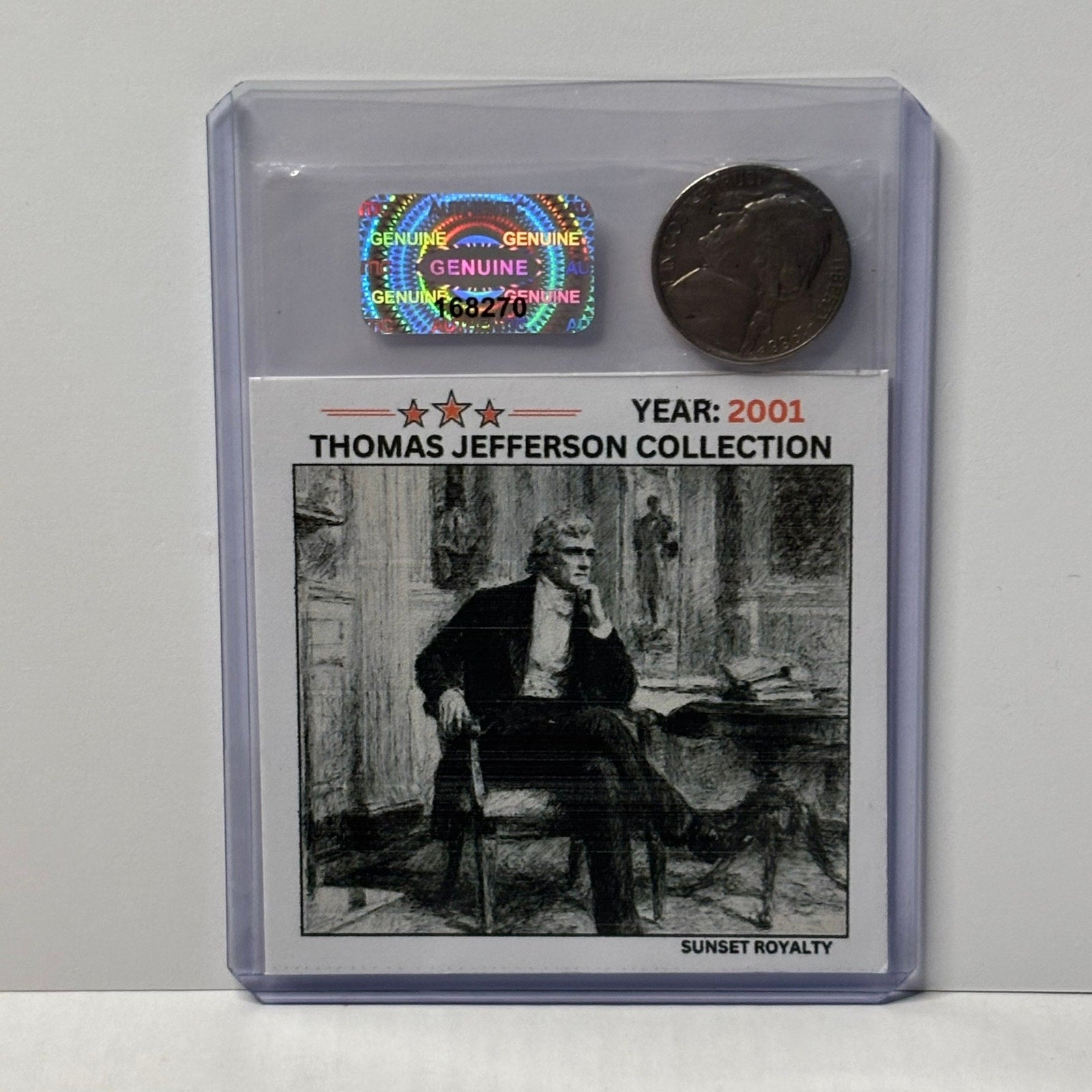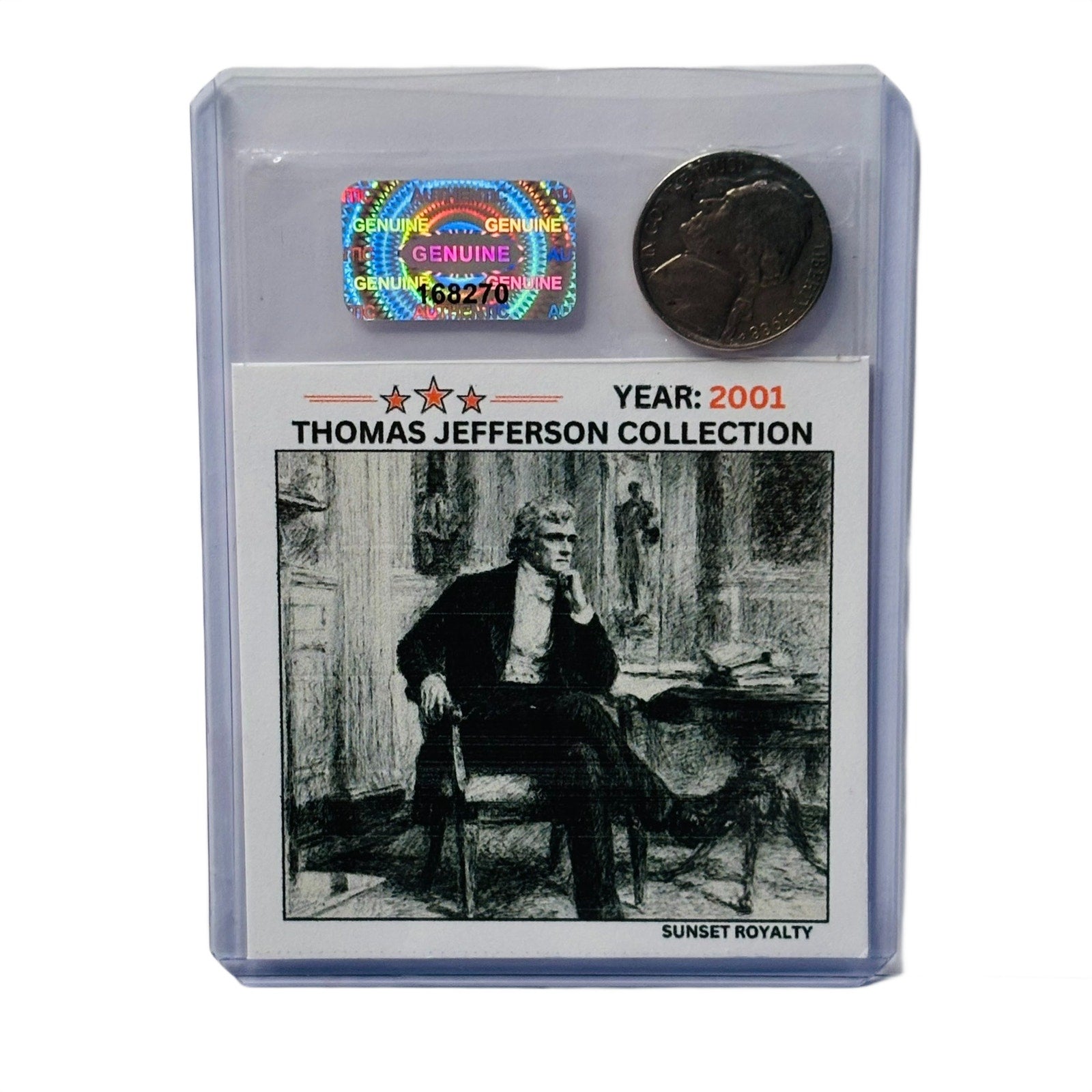 Photos shown are for display purposes only and use placeholder coins and stickers—your coin and card will be similar in style, but the year shown in the images may not match the actual coin you receive. This collection focuses exclusively on American Nickel Coins from 1975 through 2016, with a different card design and historical fact for every year featuring the great Thomas Jefferson. A great addition for coin collectors, history fans, or anyone who loves unique, display-ready collectibles.