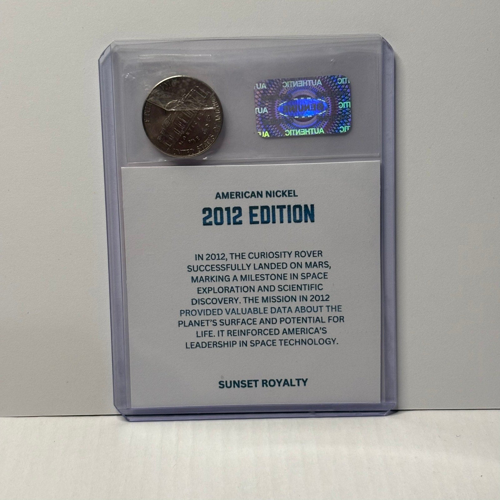 - Authentic U.S. Nickel from the year listed, securely sealed in a trading card top loader