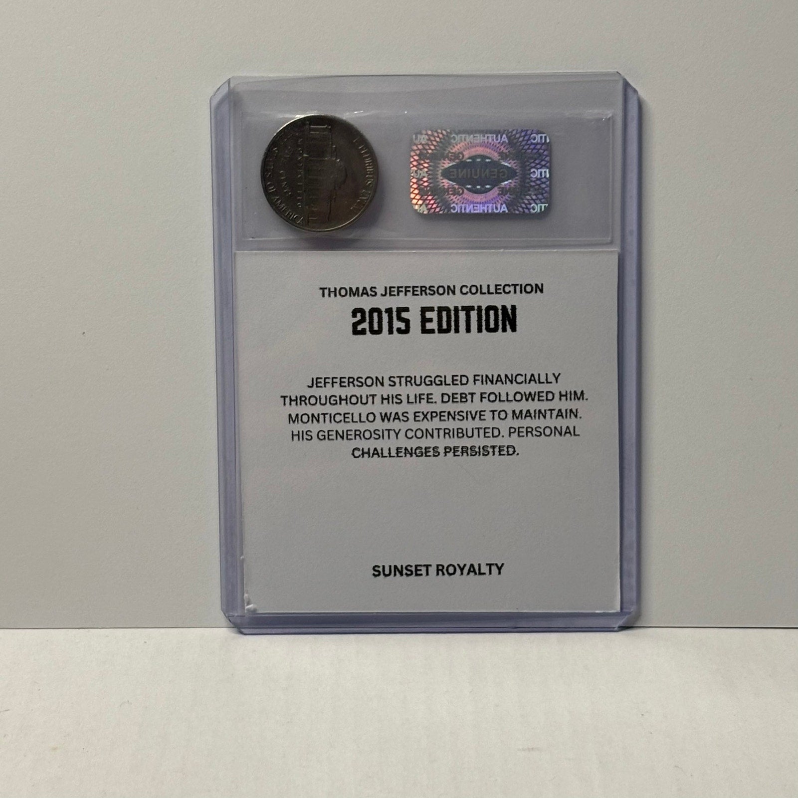 Photos shown are for display purposes only and use placeholder coins and stickers—your coin and card will be similar in style, but the year shown in the images may not match the actual coin you receive. This collection focuses exclusively on American Nickel Coins from 1975 through 2016, with a different card design and historical fact for every year featuring the great Thomas Jefferson. A great addition for coin collectors, history fans, or anyone who loves unique, display-ready collectibles.