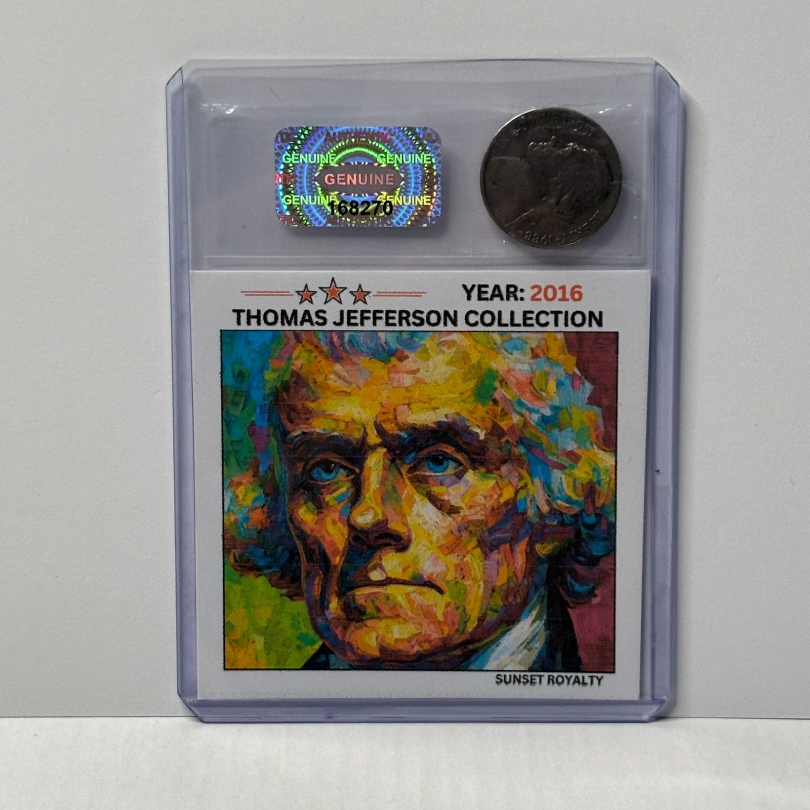 Photos shown are for display purposes only and use placeholder coins and stickers—your coin and card will be similar in style, but the year shown in the images may not match the actual coin you receive. This collection focuses exclusively on American Nickel Coins from 1975 through 2016, with a different card design and historical fact for every year featuring the great Thomas Jefferson. A great addition for coin collectors, history fans, or anyone who loves unique, display-ready collectibles.