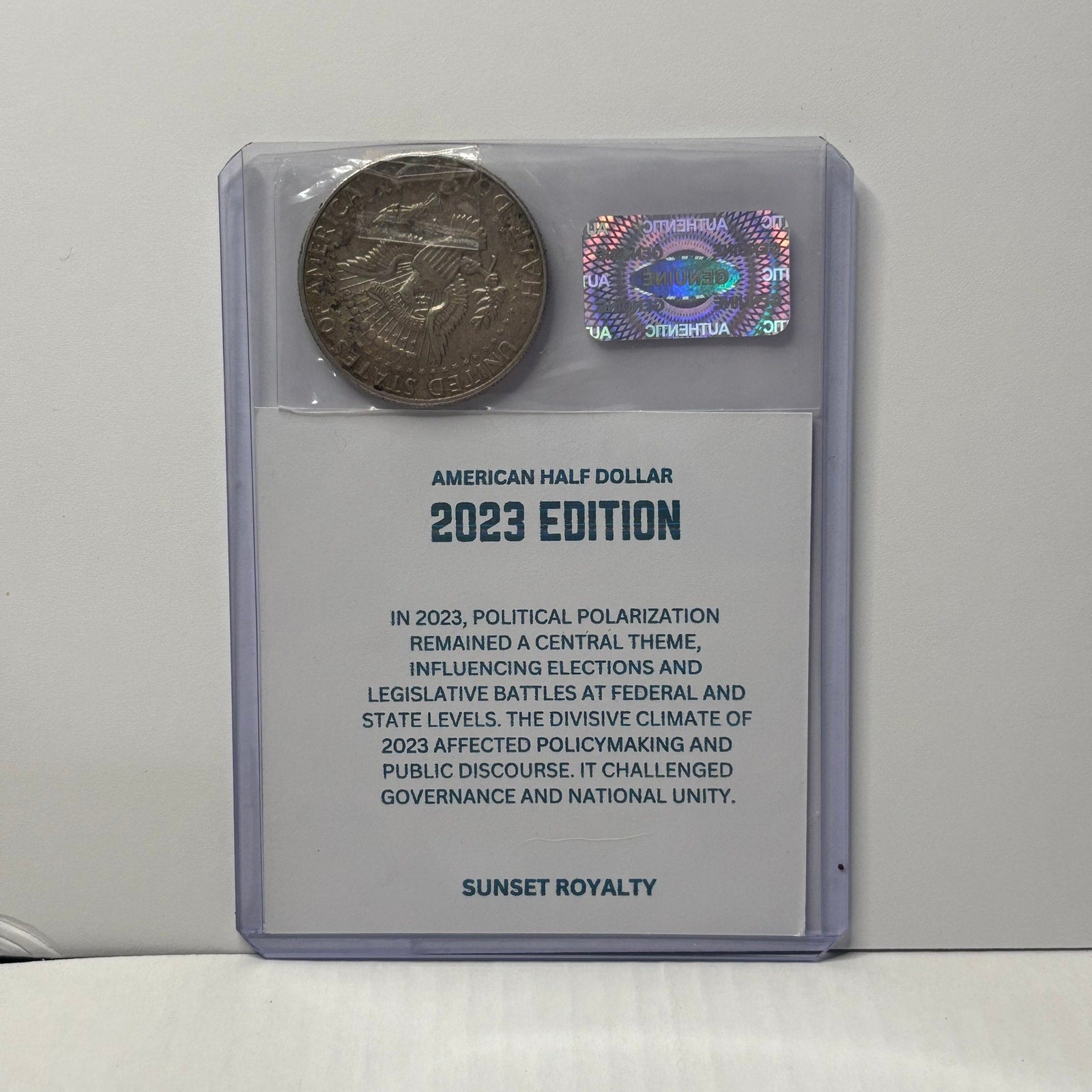 - Authentic U.S. Half Dollar from the year listed, securely sealed in a trading card top loader