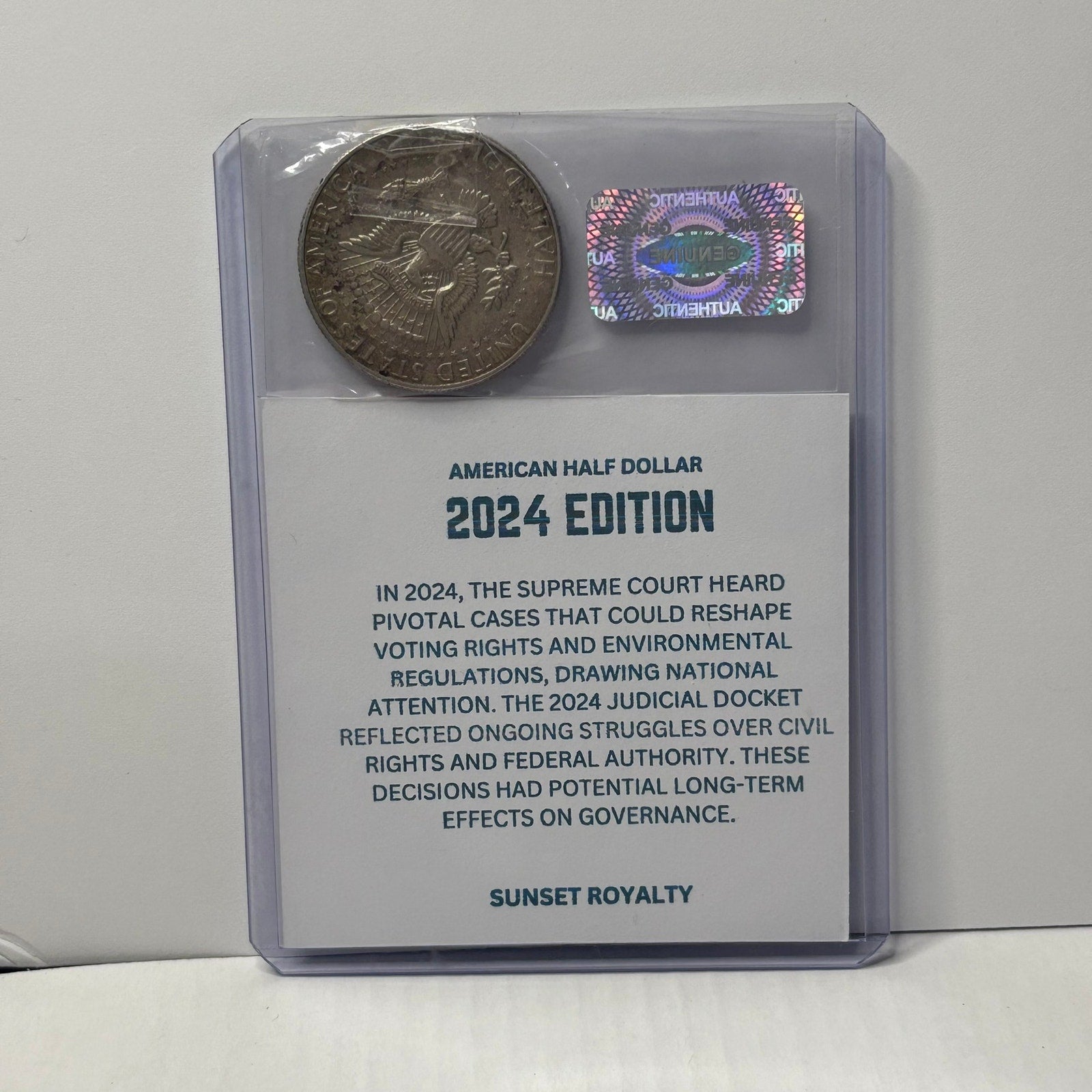- Authentic U.S. Half Dollar from the year listed, securely sealed in a trading card top loader