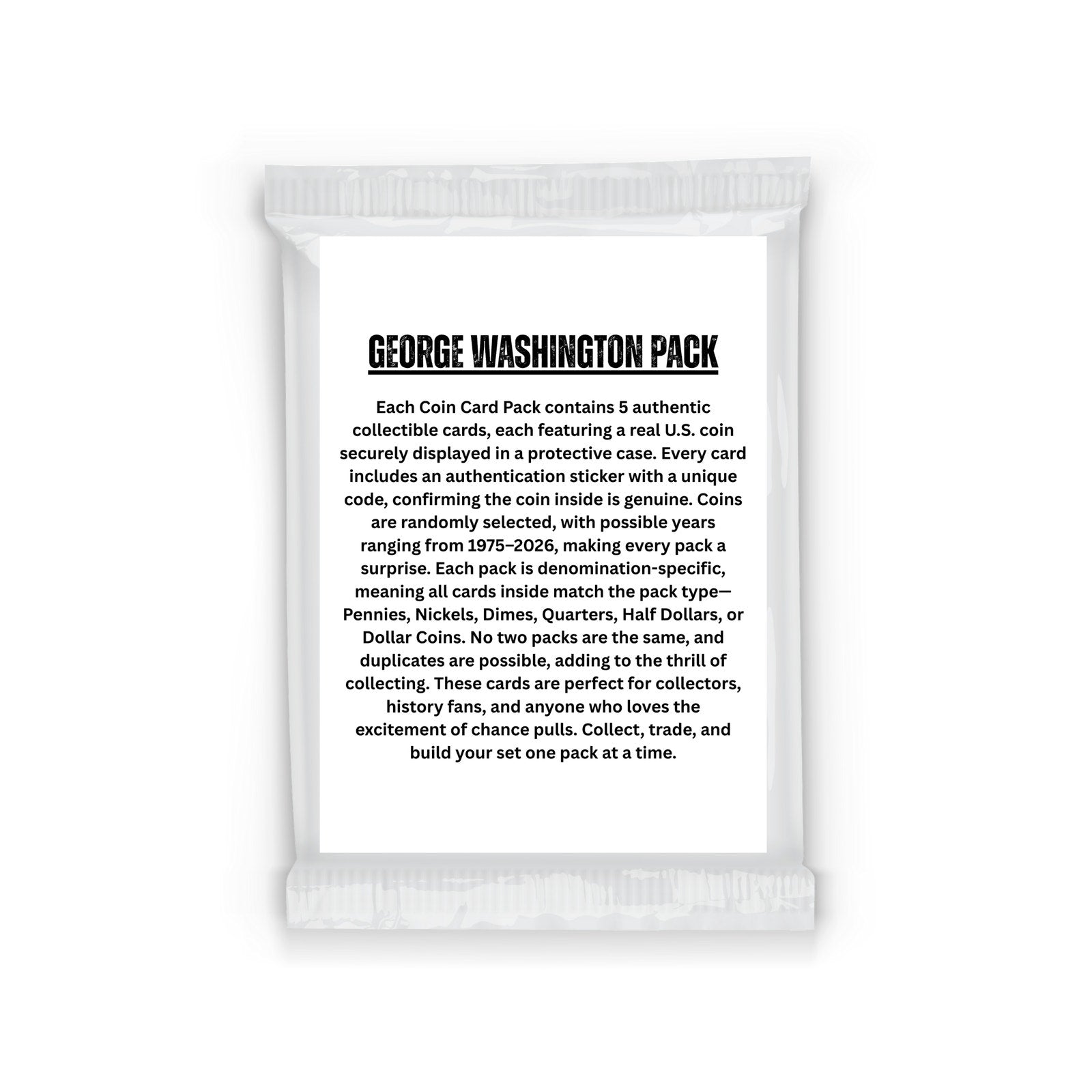 The George Washington Edition Coin Card Pack delivers a president-themed collectible experience honoring America’s first President. Each sealed pack includes 5 random Washington quarter coin cards, featuring authentic U.S. quarters dated from 1975 to 2026. Every coin is paired with a custom-designed card showcasing a Washington-themed image or portrait on the front, with historical information about the coin’s year on the back. All coins and cards are sealed in trading-card style top loaders for protection and display. With cards chosen at random, each pack offers a surprise and no two packs are guaranteed to be the same.